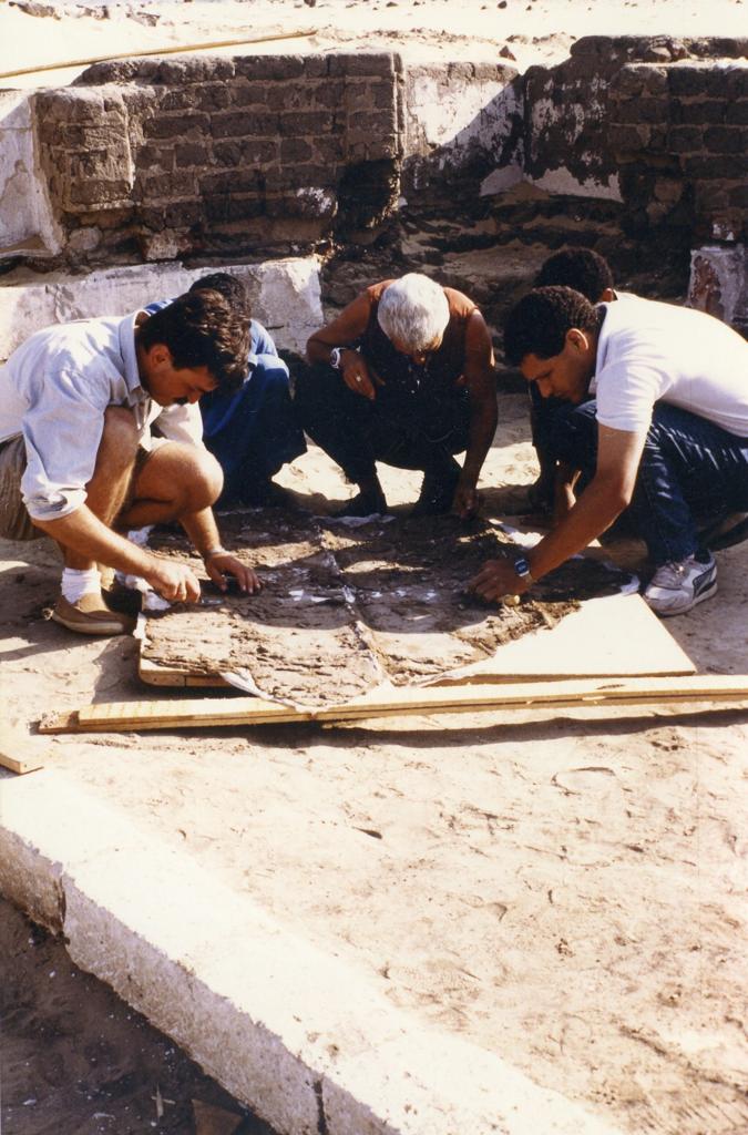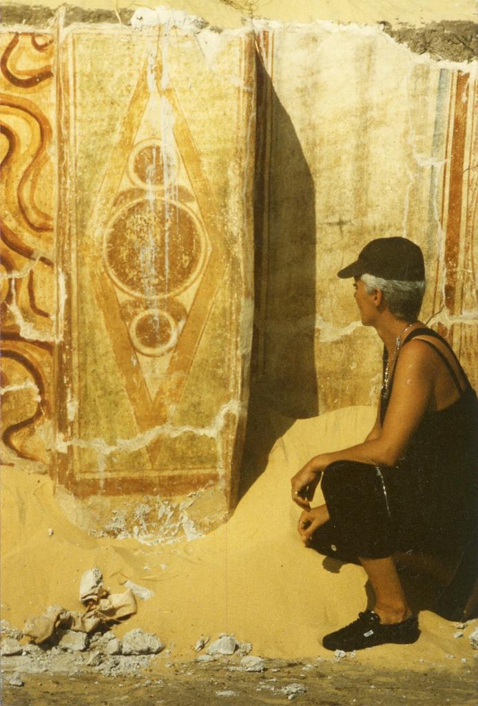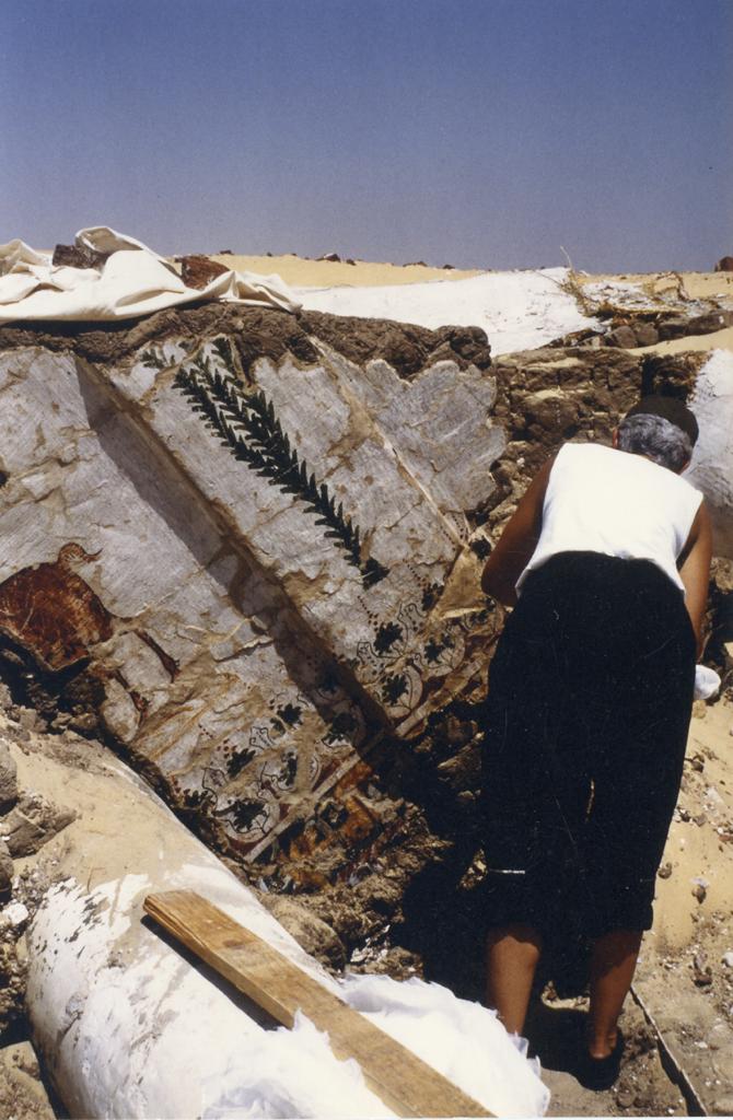Da prima una chiesa, adesso (…) uno splendido salone adiacente, proprio sui fianco del tempio, che sette archeologi austriaci, uno egiziano, la restauratrice Mencarelli ed una cinquantina di operai stanno facendo rifiorire. Ventidue metri per diciotto, pavimento a lastroni di pietra, una mole immensa di materiale: ceramiche di uso comune, vasi infissi con il vertice nella sabbia, ciotole decorate con foglie e figure di animali, monete di rame, bruciaprofumi, piccole lumiere ad olio che tanto assomigliano alla lampada di Aladino. Forse la stanza del prete o un luogo di purificezione. Perche’ in fondo si trovano un pozzo coronato da un presunto sedile ed un vasto catino simile ad un fonte battesimale inserito in una nicchia. Tutta l’area era contornata da una serie di affreschi, adesso visibili nella prima fascia alta un metro e mezzo. Barbara Mencarelli molto ha dovuto impegnarsi per fissare stabilmente le composizioni ed impedire la loro rapida dissolvenza. Si tratta di sei riquadri per parete, struttura simile all’apparenza ma in effetti sempre diversa, grandi cerchi che racchiudono altre figure collegate strettamente, colori che variano dal verde, al giallo, dal celeste pallido ad una sorta di Terra di Siena. Un racconto unitario, probabilmente, simboli che si rincorrono in attesa di una decifrazione, segni che attingono alla scienza perfetta, cioe’ la geometria, per sottolineare l’arcano del luogo.